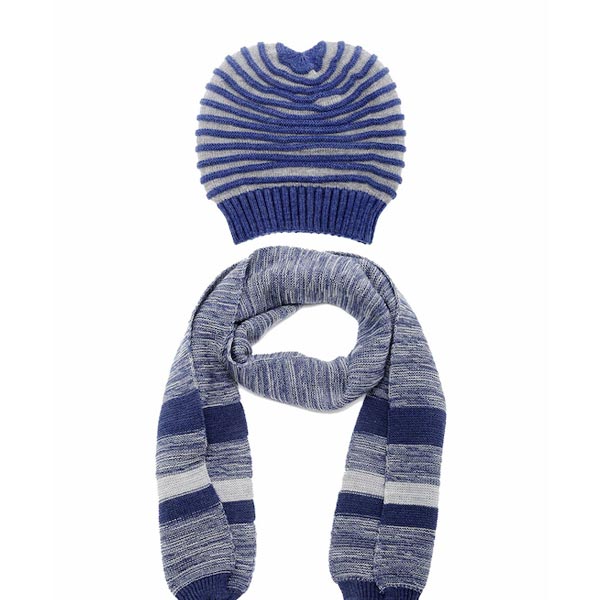 Blue and grey self design beanie, has a visor